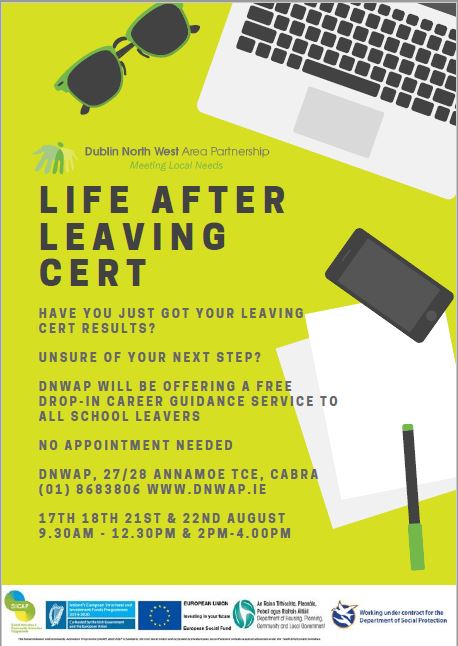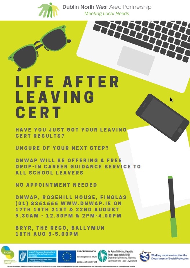 Dublin North West Area Partnership will be offering a FREE drop-in career guidance service to all school leavers from our Cabra, Ballymun and Finglas Offices. Please see posters below for times, Location and contact person No appointment needed, For more information telephone Finglas 01 836 1666 – Cabra 01 868 3806 and Ballymun 01 5490054