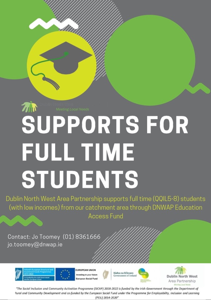 DNWAP’s Education Access Fund is available to local full time students with low incomes. Please contact Jo Toomey at (01) 8361666 or jo.toomey@dnwap.ieif you would like to apply.