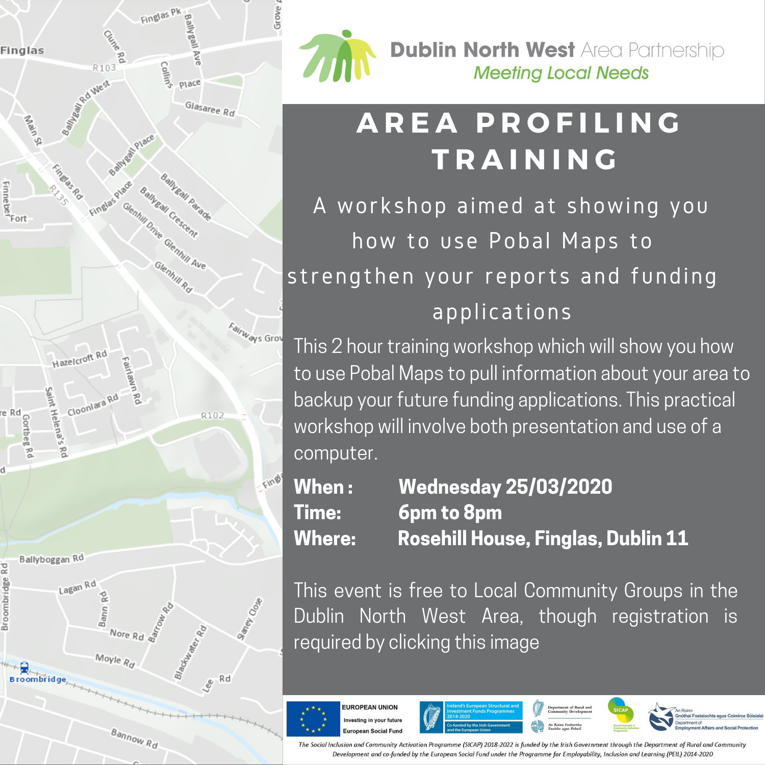 Dublin North West Area Partnership are proud to offer a 2 hour training workshop which will show you how to use Pobal Maps to pull information about your area to backup your future funding applications. This practical workshop will involve both presentation and use of a computer.