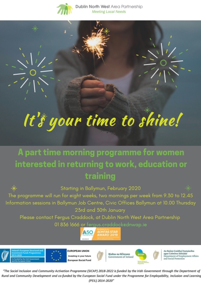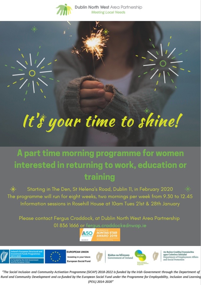Please see posters below for “Your Time to Shine programme” which we are currently promoting across both the Ballymun and Finglas areas for an early February start. For more information please Contact Fergus Craddock, Education Programmes Coordinator 01 836 1666 fergus.craddock@dnwap.ie