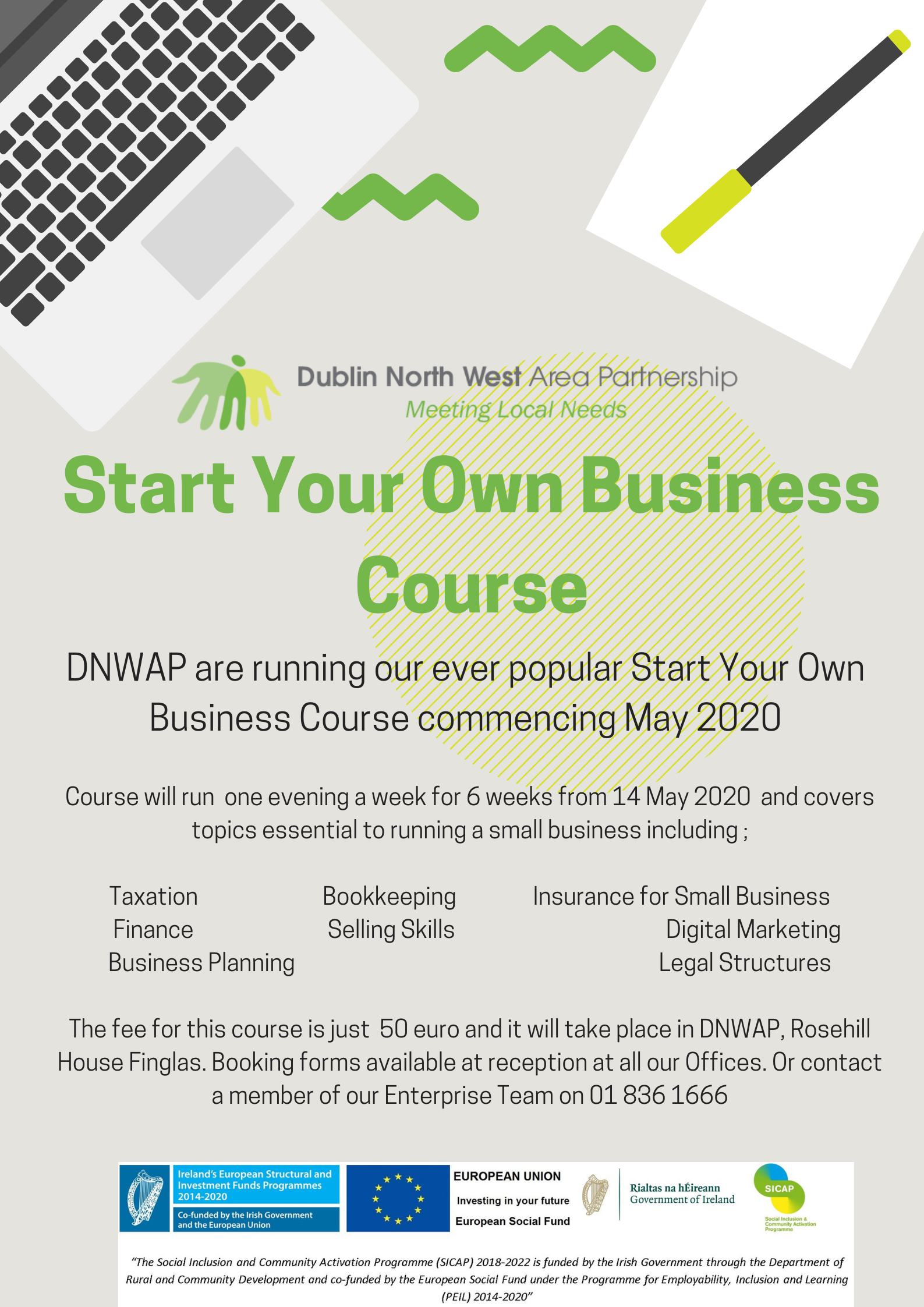 Start Your Own Business Course (Evening) 05/03/2020Trish Start Your Own Business course will begin on Thursday 14th May, Rosehill House, Finglas and the fee is €50 for the course. Please see poster below for course content and contact details