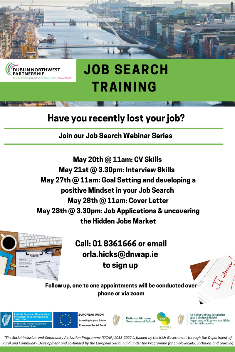 DNWAP are delighted to offer our Job Search Webinar Series. Please contact Orla Hicks to sign up 018361666 or email Orla at orla.hicks@dnwap.ie
