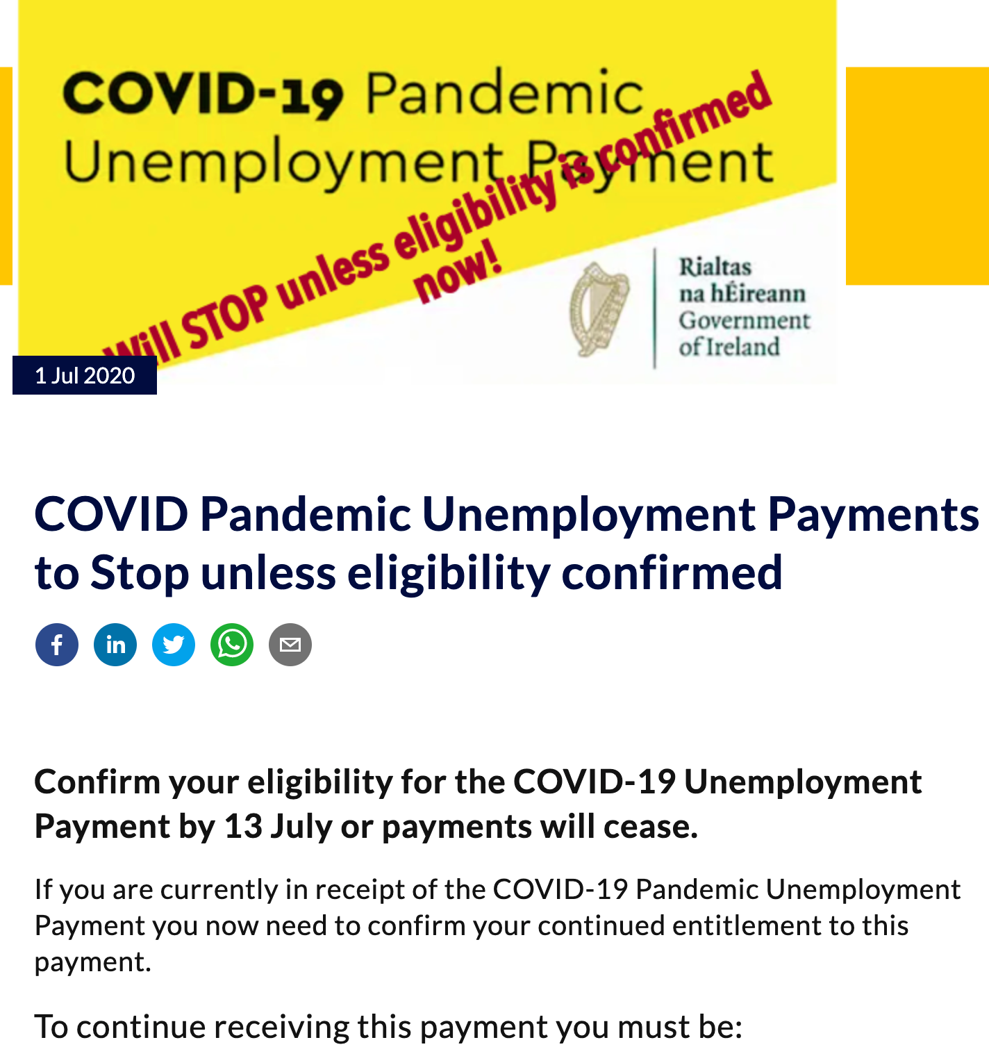 Confirm your eligibility for the COVID-19 Unemployment Payment by 13 July or payments will cease.